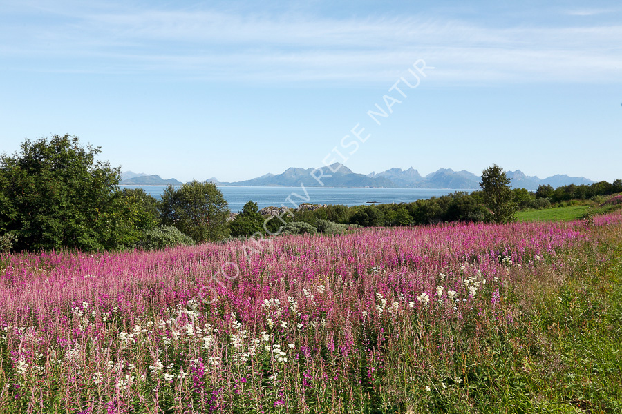 Baum, Berg, Fjord, Flora, Gebirge, Gewässer, Hadseløya, Landschaft, Nachtkerzengewächs, Nordland, Norwegen, Schmalblättriges Weidenröschen, Epilobium angustifolium, Vesterålen, Vesterålsfjorden,