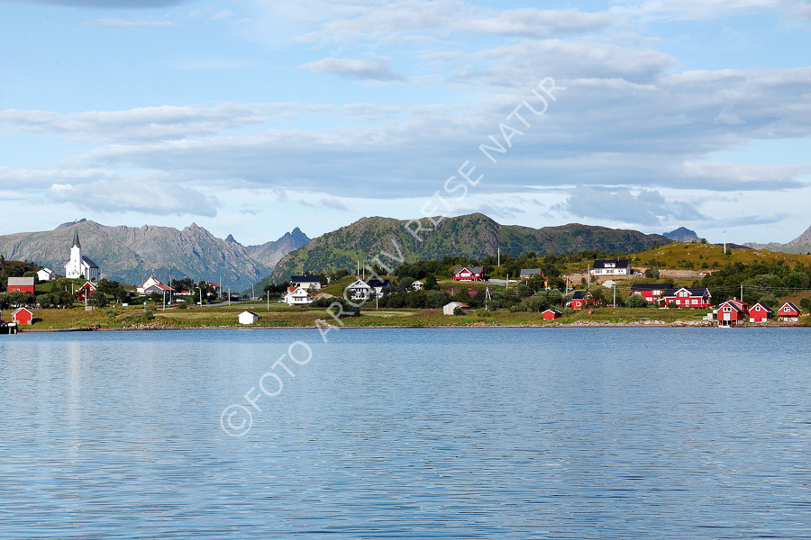 Keywords: Bauwerk, Berg, Dorf, Eide, Eidspollen, Fjord, Gebirge, Gebäude, Gewässer, Haus, Holzhaus, Kirche, Kirchturm, Kulturlandschaft, Landschaft, Langøya, Nordland, Norwegen, Sakralbau, Turm, Vesterålen, Åsanfjorden,