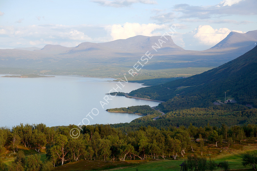 Bauwerk, Berg, Berghang, Björkliden, Gebirge, Gewässer, Landschaft, Norrbottens Län, Schweden, See, Straße, Torneträsk, Verkehrsweg, Wald,
