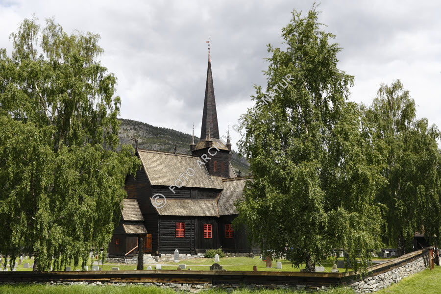 Keywords: Baum, Bauwerk, Birke, Betula, Birkengewächs, Dach, Flora, Friedhof, Gebäude, Gebäudeteil, Holzkirche, Holzschnitzkunst, Kirche, Kirchturm, Kultur, Kunst, Kunsthandwerk, Lom, Norwegen, Oppland, Ort, Sakralbau, Schindeldach, Stabkirche, Turm,