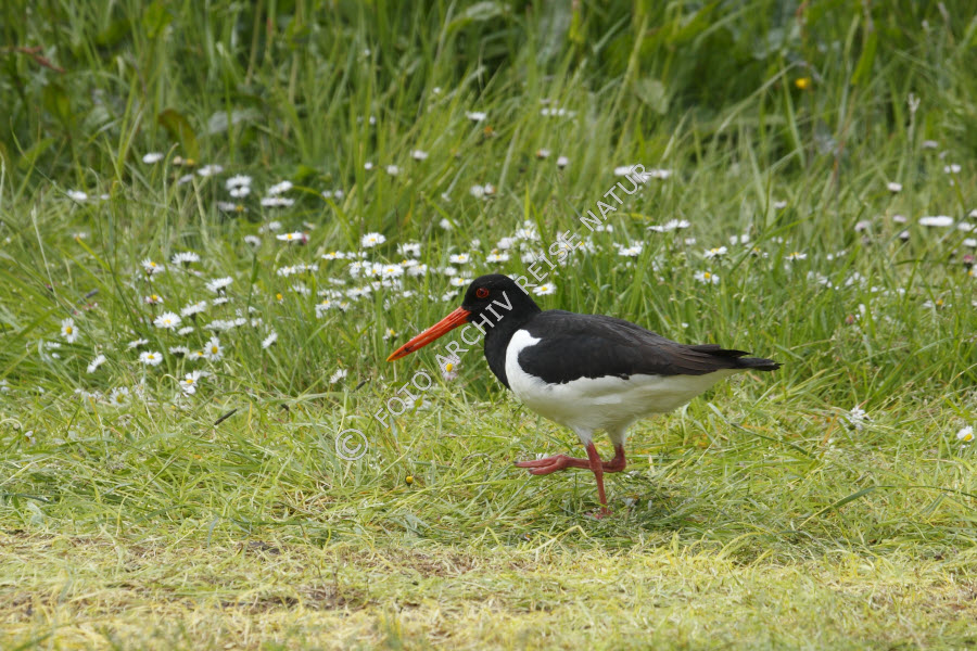 Austernfischer, Haematopus ostralegus, Bewegen, Ereignis, Farbe, Fauna, Flora, Geschehen, Goksøyr, Gras, Gänseblümchen, Bellis perennis, Insel Runde, Korbblütler, Kulturlandschaft, Laufen, Møre og Romsdal, Norwegen, Schreiten, Tätigkeit, Vogel, Watvogel, Wiese, grün, rot, schwarz, weiß,