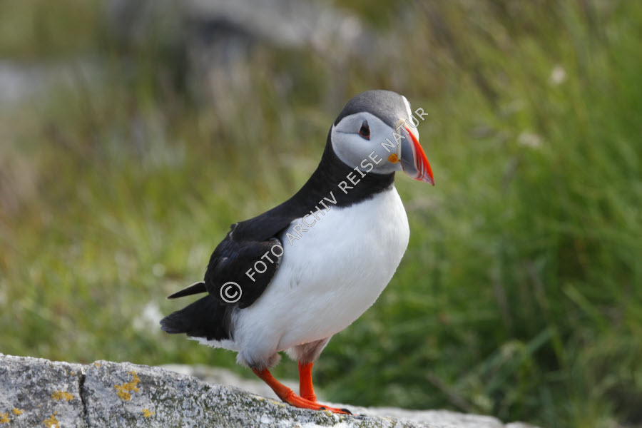 Alkenvögel, Farbe, Fauna, Felsen, Flora, Gras, Insel, Insel Runde, Landschaft, Material, Møre og Romsdal, Norwegen, Papageitaucher, Fratercula arctica, Stein, Vogel, rot, schwarz, weiß,