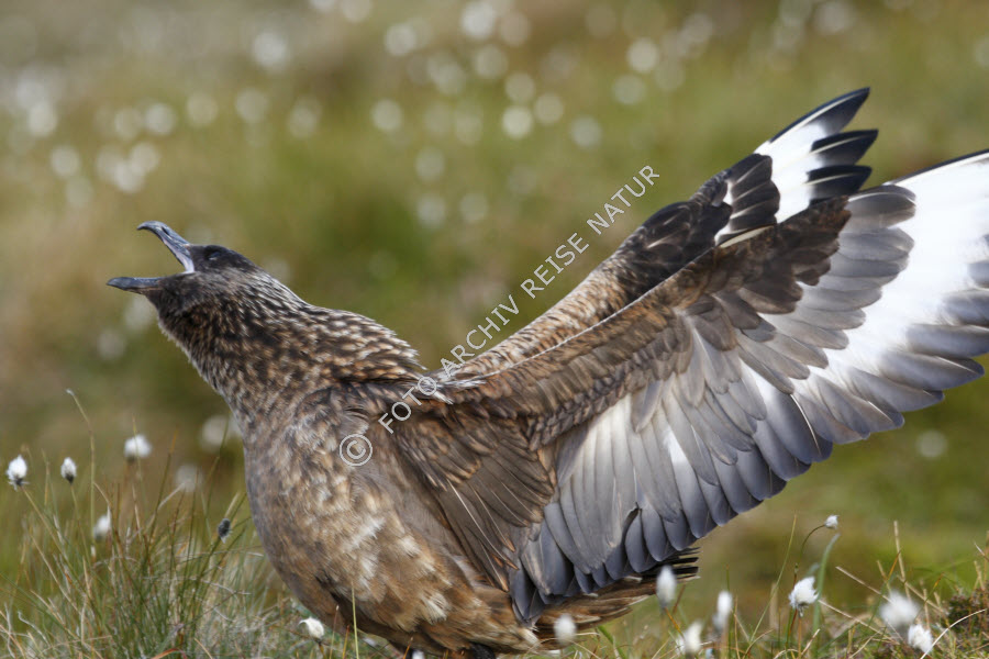 Drohen, Drohgebärde, Ereignis, Fauna, Flattern, Flora, Geschehen, Gras, Große Raubmöwe, Stercorarius skua, Insel, Insel Runde, Landschaft, Møre og Romsdal, Norwegen, Raubmöwen, Sauergrasgewächs, Scheuchzers Wollgras, Eriophorum scheuchzeri, Tätigkeit, Vogel,