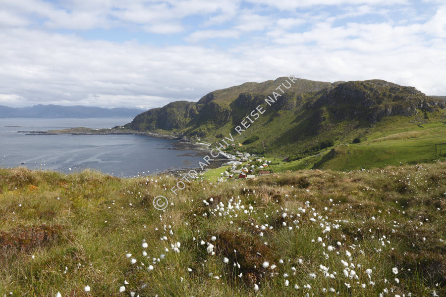 Bauwerk, Berg, Berghang, Bergrücken, Dorf, Flora, Gebäude, Gewässer, Goksøyr, Gras, Grasbüschel, Haus, Insel, Insel Runde, Kulturlandschaft, Landschaft, Meer, Møre og Romsdal, Nordmeer, Norwegen, Sauergrasgewächs, Scheuchzers Wollgras, Eriophorum scheuchzeri, Weide, Weiler, Wiese, Wiesenhang,