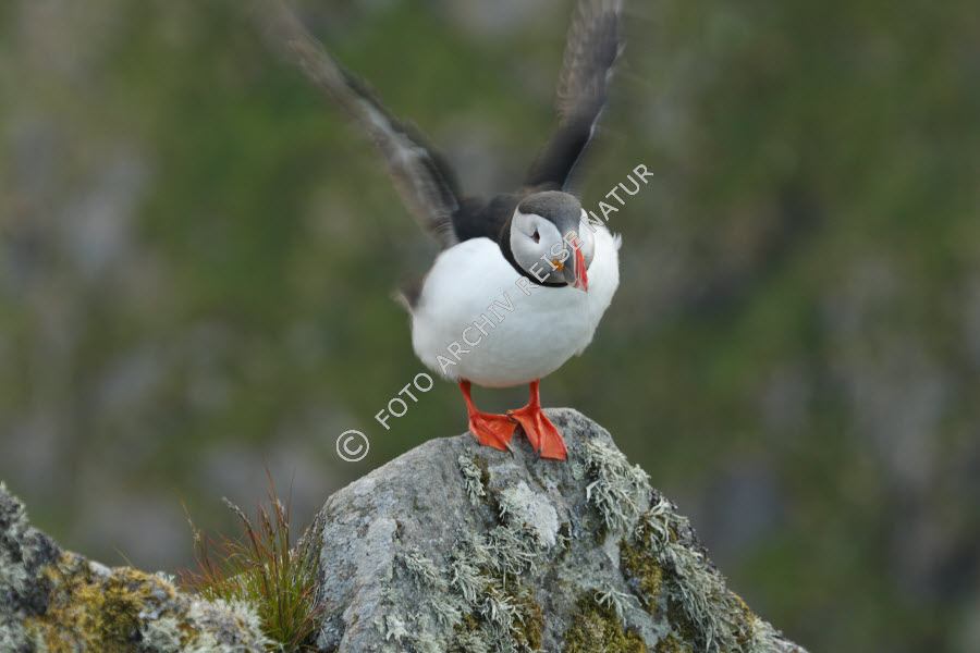 Alkenvögel, Bewegen, Ereignis, Farbe, Fauna, Felsblock, Felsbrocken, Felsen, Fliegen, Flora, Geschehen, Gras, Insel, Insel Runde, Landschaft, Material, Møre og Romsdal, Norwegen, Papageitaucher, Fratercula arctica, Stein, Tätigkeit, Vogel, rot, schwarz, weiß,