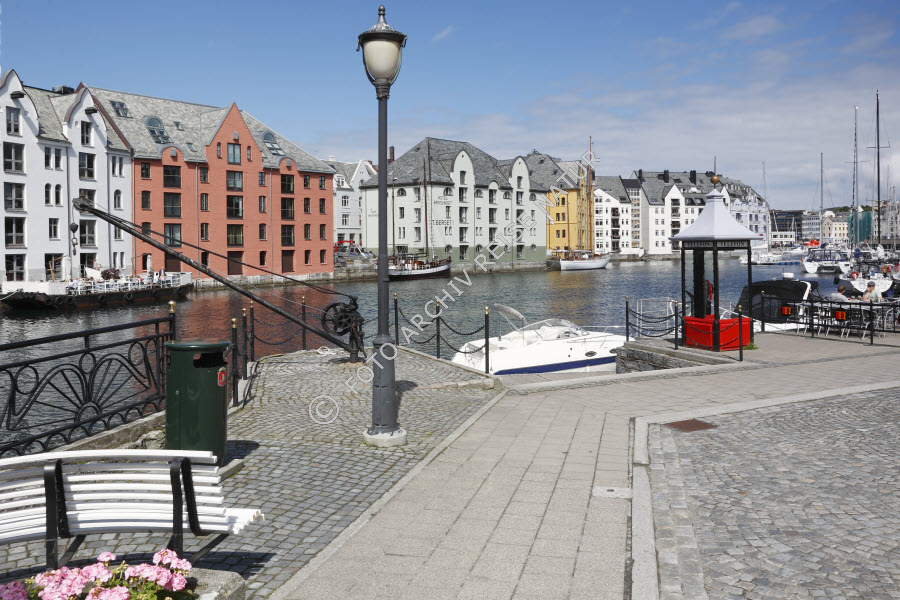 Baustil, Bauwerk, Bootsanleger, Dach, Dachgaube, Gebäudeteil, Gegenstand, Gewässer, Giebel, Hafenstadt, Jugendstil, Kulturlandschaft, Landschaft, Laterne, Leuchtmittel, Meer, Møre og Romsdal, Nordmeer, Norwegen, Stadt, Stadtansicht, Straßenlaterne, Ålesund,