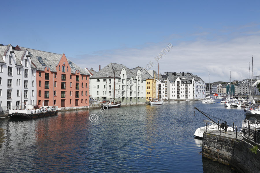Baustil, Bauwerk, Bootsanleger, Dach, Dachgaube, Gebäudeteil, Gewässer, Giebel, Hafen, Hafenmauer, Hafenstadt, Jugendstil, Kai, Kulturlandschaft, Landschaft, Meer, Møre og Romsdal, Nordmeer, Norwegen, Stadt, Stadtansicht, Ålesund,