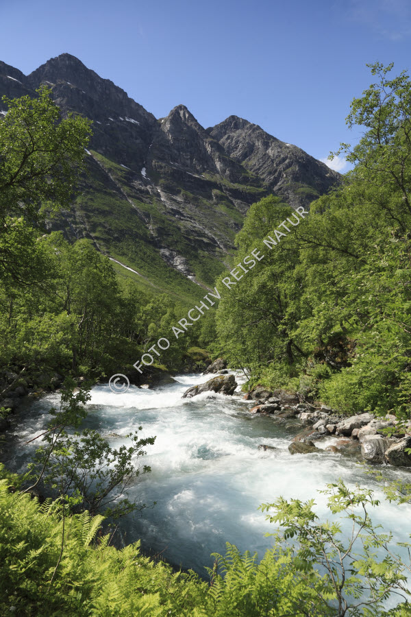 Bach, Berg, Bergkette, Bergspitze, Bergwald, Fluss, Gebirge, Gebirgsbach, Gewässer, Gipfel, Grøvdal, Landschaft, Møre og Romsdal, Norwegen, Stromschnelle, Wald, Wiese, Wiesenhang, Åndalsnes, Rauma,