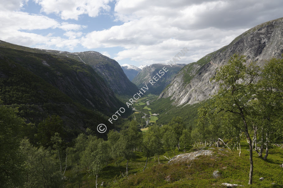 Bach, Baum, Berg, Bergwald, Birke, Betula, Birkengewächs, Eikesdalen, Felsen, Felshang, Felswand, Fjellbirke, Betula pubescens, Flora, Gebirgsbach, Gewässer, Gipfel, Kulturlandschaft, Landschaft, Material, Møre og Romsdal, Nesset, Norwegen, Stein, Tal, Wald, Weide,