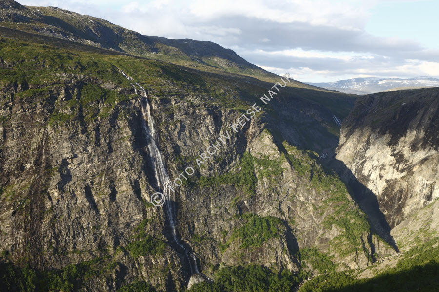 Bergwald, Eikesdalen, Felsen, Felshang, Felswand, Finnset, Gewässer, Landschaft, Material, Møre og Romsdal, Nesset, Norwegen, Stein, Wald, Wasserfall, Wiese, Wiesenhang,