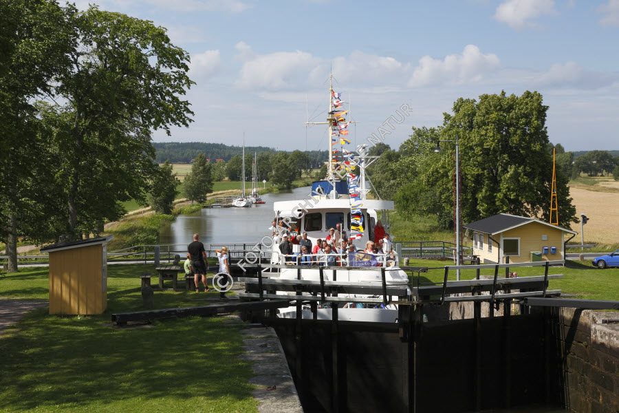 Ausflugsdampfer, Ausflugsschiff, Baum, Bauwerk, Dampfer, Deck, Fahrzeug, Flora, Götakanal, Kanal, Kulturlandschaft, Person, Rasen, Reisender, Riksberg, Schiff, Schleuse, Schleusentor, Schweden, Töreboda, Verkehrsmittel, Verkehrsweg, Västra Götlands län, Wasserfahrzeug, Wetter, Klima, Wiese, Wolke,