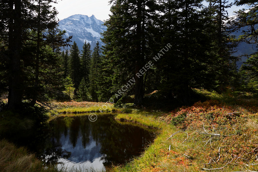 Baum, Berg, Bergwald, Blaubeere, Vaccinium myrtillus, Fichte, Picea, Flora, Gewässer, Heidekrautgewächs, Hohe Tauern, Hoher Sonnenblick, Kieferngewächs, Kolm Saigurn, Landschaft, Nationalpark, Ort, Rauris, Rauriser Urwald, Salzburger Land, Tümpel, Wald, Österreich,