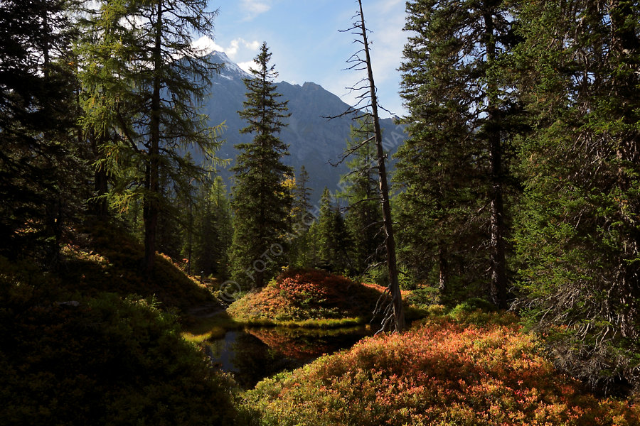 Baum, Berg, Bergwald, Blaubeere, Vaccinium myrtillus, Fichte, Picea, Flora, Gebirge, Gewässer, Heidekrautgewächs, Hocharn, Hohe Tauern, Holz, Kieferngewächs, Kolm Saigurn, Landschaft, Lärche, Larix, Material, Nationalpark, Ort, Rauris, Rauriser Urwald, Salzburger Land, Totholz, Tümpel, Wald, Österreich,