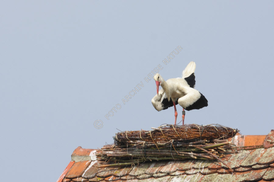 Keywords: Dach, Deutschland, Fauna, Gebäudeteil, Nest, Rühstäd, Sachsen-Anhalt, Schindeldach, Storchennest, Störche, Tierbau, Vogel, Weißstorch, Ciconia ciconia,