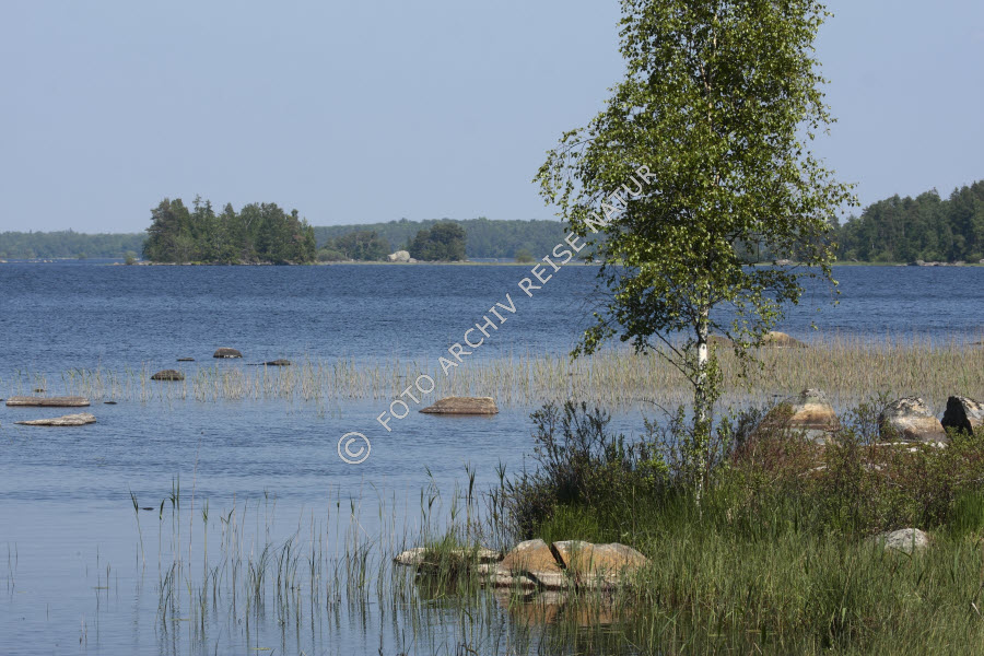 Baum, Birke, Betula, Birkengewächs, Birkenstamm, Flachwasserzone, Flora, Gewässer, Gras, Landschaft, Schilfrohr , Phragmites australis, See, Süßgras, Åsnen,