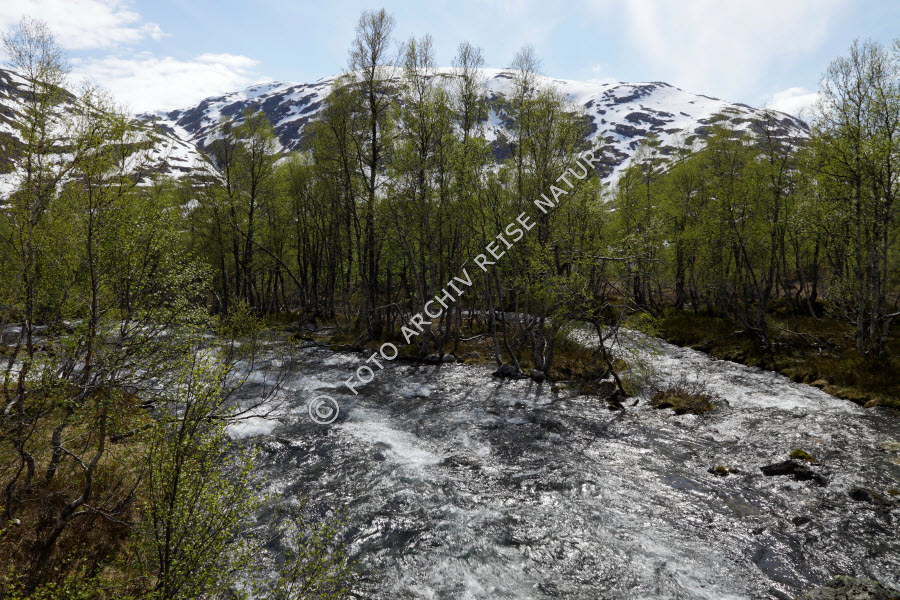 Auwald, Bach, Baum, Berg, Berghang, Birke, Betula, Birkengewächs, Birkenwald, Felsen, Fjellbirke, Betula pubescens, Flora, Flussgeröll, Gaularfjellet, Gebirgsbach, Geröll, Gewässer, Landschaft, Laubwald, Material, Norwegen, Sogn og Fjordane, Stein, Wald,