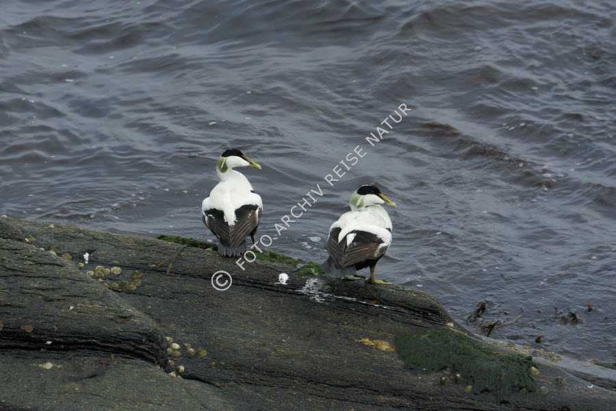 Eiderente, Somateria mollissima, Entenvögel, Fauna, Felsen, Felsküste, Goksøyr, Insel, Insel Runde, Küste, Landschaft, Material, Møre og Romsdal, Norwegen, Stein, Vogel,