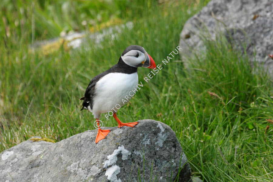 Alkenvögel, Fauna, Felsblock, Felsen, Goksøyr, Insel, Insel Runde, Landschaft, Material, Møre og Romsdal, Norwegen, Papageitaucher, Fratercula arctica, Stein, Vogel, Wiese, Wiesenhang,