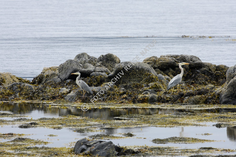 Algen, Blasentang, Fucus vesiculosus, Farbe, Fauna, Flora, Gewässer, Graureiher, Ardea cinera, Insel, Insel Runde, Körperteil, Landschaft, Meer, Møre og Romsdal, Nordmeer, Norwegen, Reiher, Schnabel, Seetang, Vogel, grau,