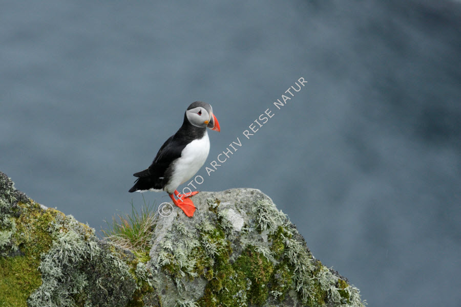 Alkenvögel, Fauna, Felsbrocken, Felsen, Goksøyr, Insel, Insel Runde, Landschaft, Material, Møre og Romsdal, Norwegen, Papageitaucher, Fratercula arctica, Stein, Vogel,