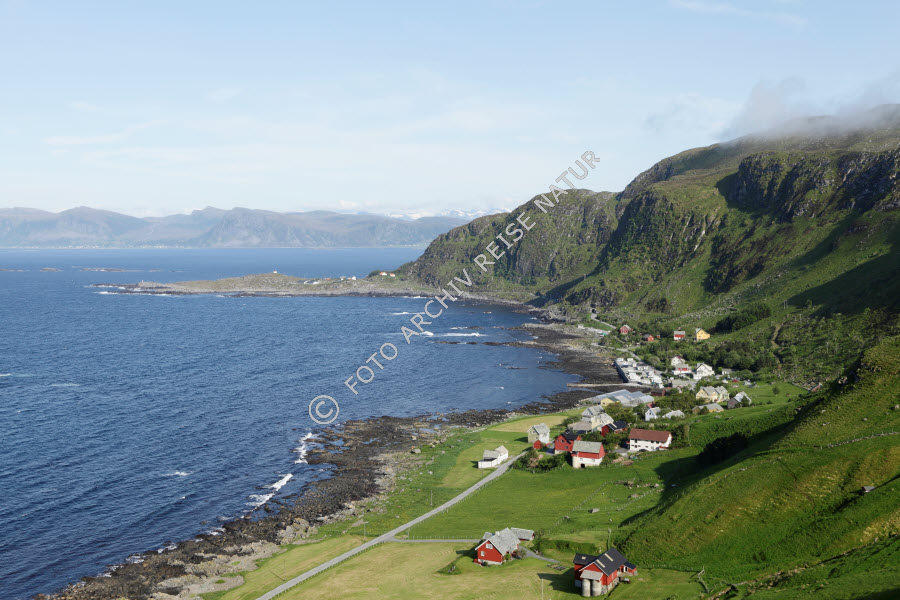 Bergkette, Dorf, Felsen, Felswand, Gebirge, Gewässer, Goksøyr, Insel, Insel Runde, Kulturlandschaft, Küste, Landschaft, Material, Meer, Møre og Romsdal, Nordmeer, Norwegen, Steilküste, Stein, Weiler, Wiese, Wiesenhang,