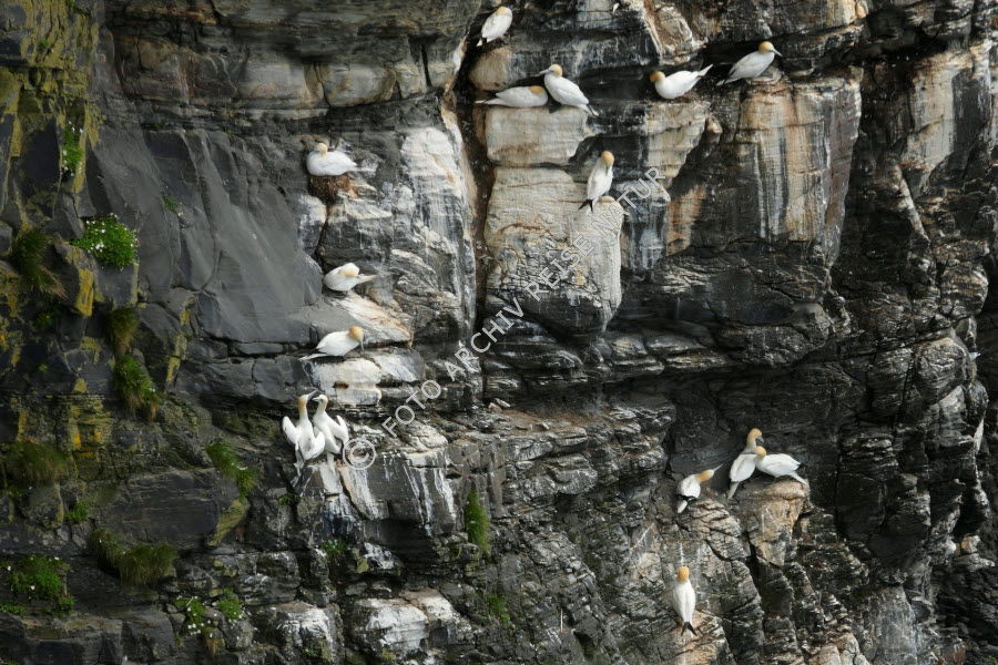 Keywords: Felsen, Felshang, Felsklippe, Felswand, Gewässer, Goksøyr, Insel, Insel Runde, Küste, Landschaft, Material, Meer, Møre og Romsdal, Nordmeer, Norwegen, Steilküste, Stein, Vogelfelsen,