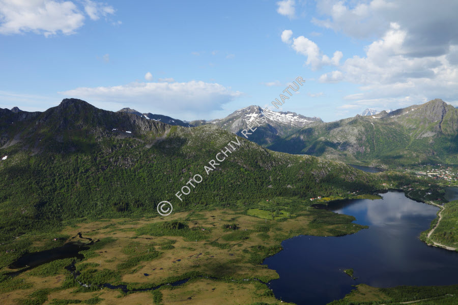Austvågøya, Berg, Bergkette, Blåtinden, Feuchtgebiet, Fluss, Gebirge, Gewässer, Hochmoor, Kongselva, Landschaft, Litl-Kongsvatnet, Lofoten, Moor, Nordland, Norwegen, See, Sumpfwiese, Svolvær,