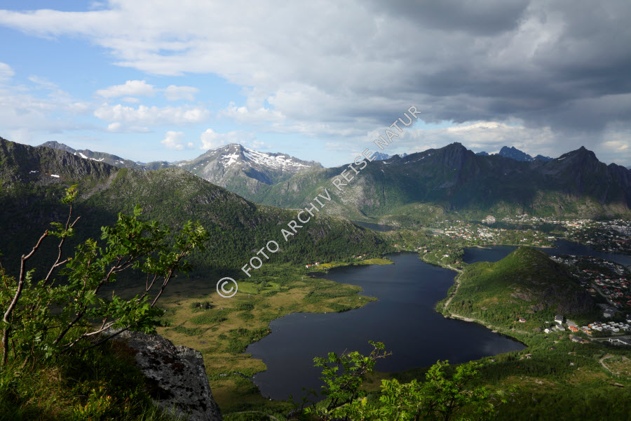 Austvågøya, Berg, Bergkette, Bergwald, Blåtinden, Fløya, Gebirge, Gewässer, Landschaft, Litl-Kongsvatnet, Lofoten, Nordland, Norwegen, See, Svolvær, Wald,