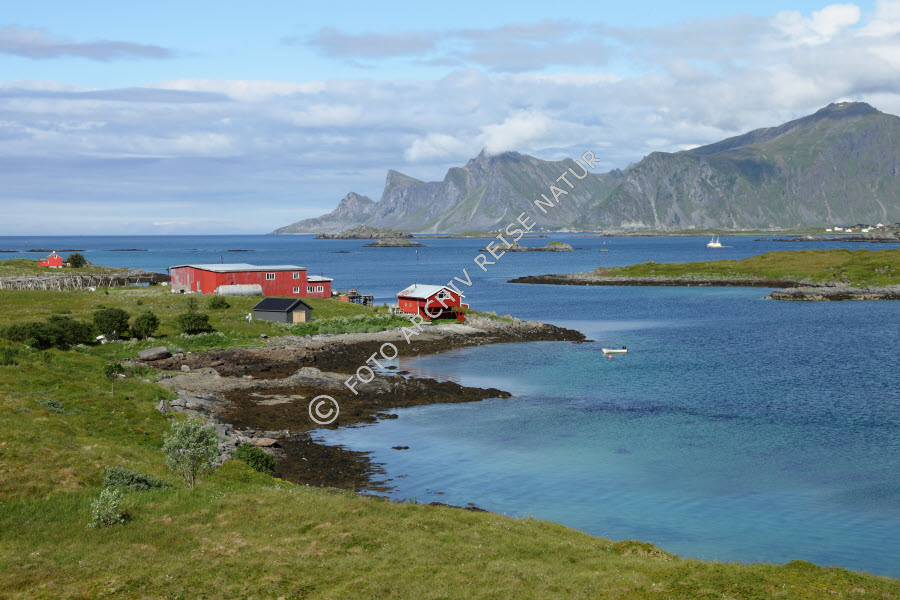 Bauwerk, Bergkette, Brandungsgeröll, Felsen, Felsenstrand, Fischerhütte, Fredvang, Gebirge, Gebäude, Gegenstand, Geröll, Gestell, Gewässer, Hütte, Insel, Landschaft, Lofoten, Material, Meer, Moskenesøy, Nordland, Nordmeer, Norwegen, Rorbu, Schäre, Stein, Stockfisch-Trockengestell, Strand, Wiese,