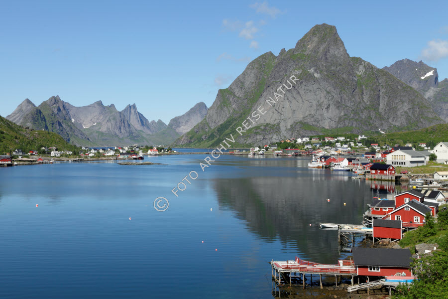 Bauwerk, Berg, Bergkette, Bootsanleger, Farbe, Fischerhütte, Fjord, Gebirge, Gebäude, Gewässer, Holzhütte, Hütte, Landschaft, Lofoten, Moskenesøy, Nordland, Norwegen, Olstinden, Pfahlbau, Reine, Reinefjorden, Rorbu, blau, rot,