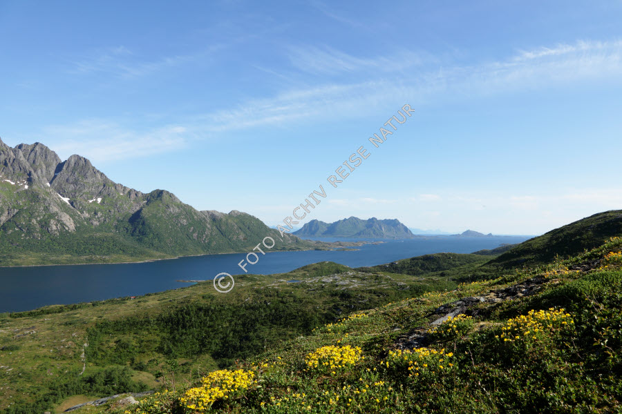 Austnesfjorden, Austvågøya, Farbe, Fjord, Gewässer, Landschaft, Lofoten, Nordland, Norwegen, Sildpollen, blau, gelb,