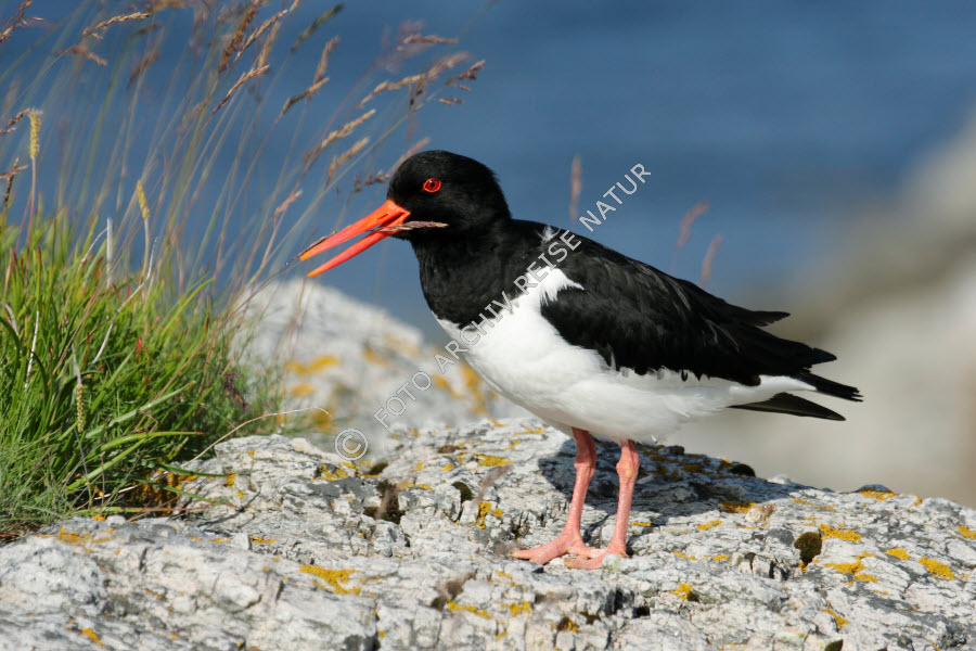 Austernfischer, Haematopus ostralegus, Fauna, Felsküste, Flakstad, Flakstadøy, Flora, Gras, Grasbüschel, Küste, Landschaft, Lofoten, Nordland, Norwegen, Vogel, Watvogel,