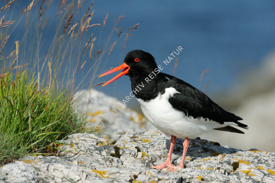 Austernfischer, Haematopus ostralegus, Fauna, Felsküste, Flakstad, Flakstadøy, Flora, Gras, Grasbüschel, Küste, Landschaft, Lofoten, Nordland, Norwegen, Vogel, Watvogel,