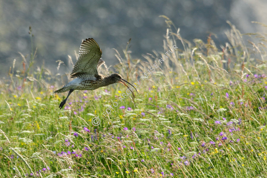 Bewegen, Blumenwiese, Ereignis, Farbe, Fauna, Flakstad, Flakstadøy, Fliegen, Frühsommerwiese, Geschehen, Großer Brachvogel, Numenius arquata, Landschaft, Lofoten, Nordland, Norwegen, Schnepfenvogel, Tätigkeit, Vogel, Watvogel, Wiese, grün,