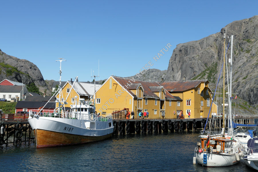 Keywords: Bauwerk, Boot, Fahrzeug, Felsen, Felswand, Fischerboot, Fischereihafen, Fischerhütte, Fischkutter, Flakstadøy, Gebäude, Hafen, Haus, Holzhaus, Hütte, Lagerhaus, Lofoten, Material, Mole, Nordland, Norwegen, Nusfjord, Pfahlbau, Rorbu, Schiffsanleger, Speicher, Stein, Verkehrsmittel, Wasserfahrzeug,