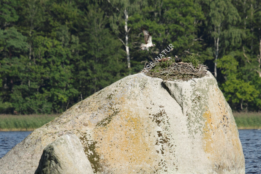 Agnäs, Beute, Fauna, Felsblock, Felsen, Felseninsel, Fisch, Fischadler, Pandion haliaetus, Flora, Gewässer, Gras, Greifvögel, Insel, Landschaft, Material, Naturschutzgebiet, Ort, Schilfgürtel, Schilfrohr , Phragmites australis, See, Stein, Süßgras, Ufer, Vogel, Wald, Waldrand, Åsnen,