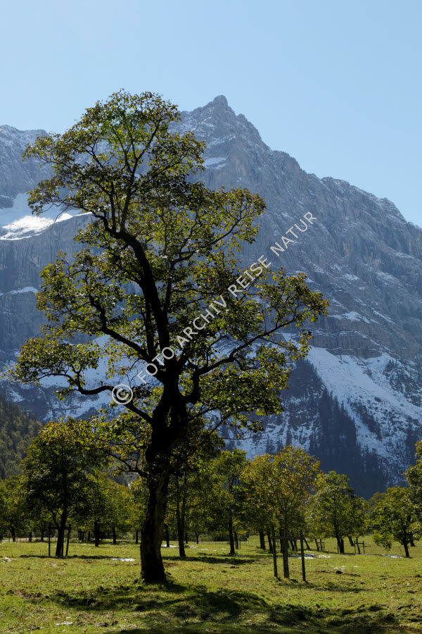 Ahorngewächse, Alm, Baum, Berg, Bergahorn, Acer pseudoplatanus, Bergspitze, Engalm, Flora, Gebirge, Großer Ahornboden, Hinterriss, Hochtal, Karwendel, Kulturlandschaft, Landschaft, Tal, Tirol, Vomp, Weide, Österreich,