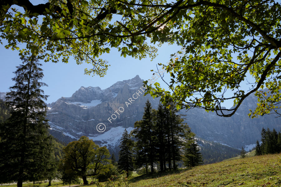 Ahorngewächse, Alm, Baum, Bergahorn, Acer pseudoplatanus, Bergwald, Engalm, Fichte, Picea, Flora, Gebirge, Großer Ahornboden, Hinterriss, Hochtal, Karwendel, Kieferngewächs, Kulturlandschaft, Landschaft, Tal, Tirol, Vomp, Wald, Weide, Österreich,