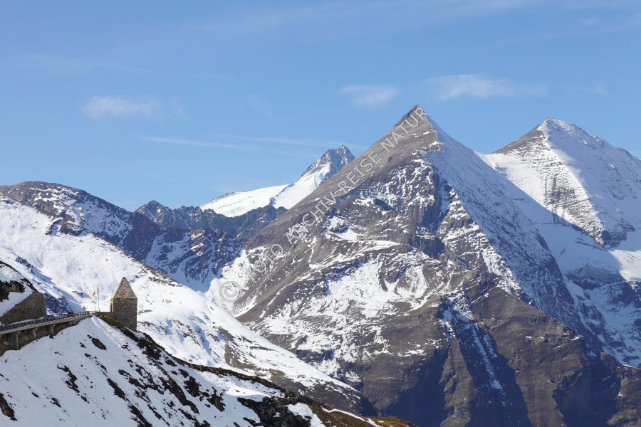 Bauwerk, Berg, Bergkette, Bergrücken, Bergspitze, Felsen, Felshang, Felswand, Ferleiten, Gebirge, Gebirgsstraße, Gipfel, Grat, Großglockner Hochalpenstraße, Hohe Tauern, Kurve, Kärnten, Landschaft, Material, Nationalpark, Ort, Serpentine, Stein, Straße, Verkehrsweg, Österreich,