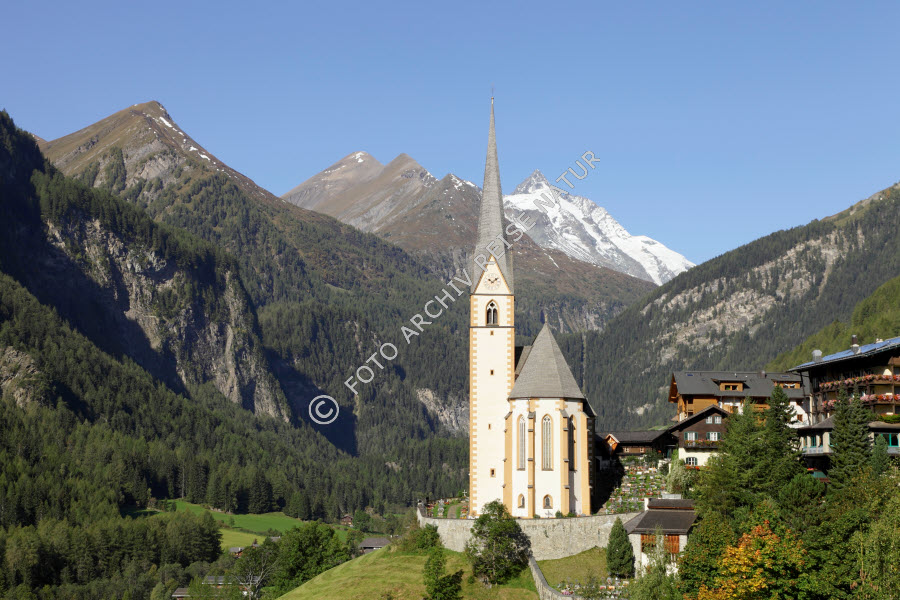 Baustil, Bauwerk, Berg, Bergdorf, Berghang, Bergspitze, Bergwald, Dorf, Gebirge, Gebäude, Gegenstand, Gipfel, Gotik, Großglockner, Heiligenblut, Hochtal, Hohe Tauern, Kirche, Kirchenschiff, Kirchturm, Kulturlandschaft, Kärnten, Landschaft, Nadelwald, Nationalpark, Ort, Sakralbau, Stadt, Stadtansicht, Tal, Turm, Turmuhr, Uhr, Wald, Wallfahrtskirche, Österreich,