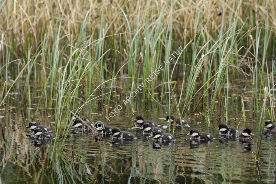 Entenküken, Entenvögel, Fauna, Flora, Gewässer, Gras, Landschaft, Schellente, Bucephala clangula, Schilfrohr , Phragmites australis, See, Süßgras, Vogel, Åsnen,
