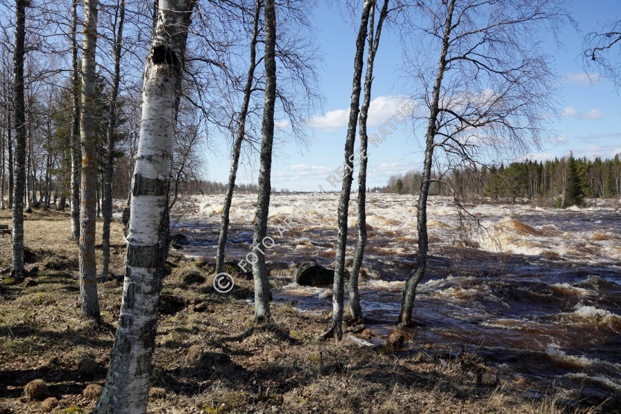 Baum, Birke, Betula, Birkengewächs, Flora, Fluss, Gewässer, Landschaft, Stromschnelle, Torneälven, Wasserfall,