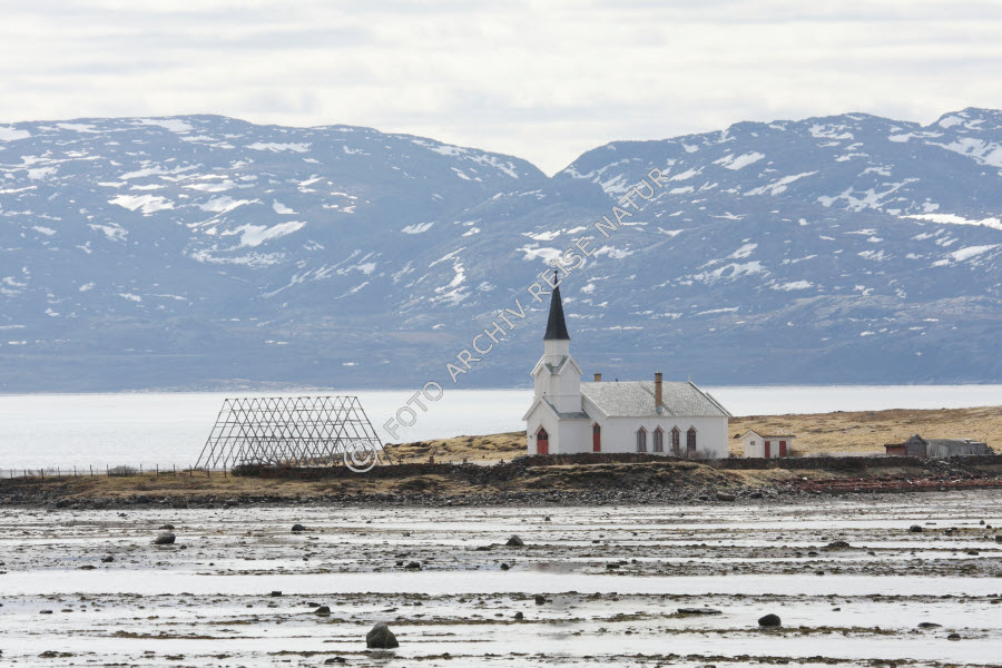 Bauwerk, Berg, Bergrücken, Finnmark, Fjord, Gebäude, Gegenstand, Gestell, Gewässer, Holzkirche, Kirche, Kirchturm, Landschaft, Lappland, Nesseby, Norwegen, Sakralbau, Stockfisch-Trockengestell, Turm, Varanger, Værangsfjorden,