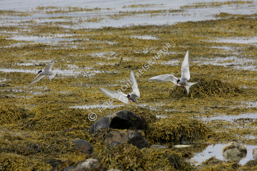 Algen, Barentssee, Blasentang, Fucus vesiculosus, Ebbe, Ekkerøy, Fauna, Finnmark, Flora, Fluss-Seeschwalbe, Sterna hirundo, Geröllstrand, Gewässer, Gezeiten, Landschaft, Lappland, Meer, Norwegen, Seeschwalben, Seetang, Strand, Varanger, Vogel,