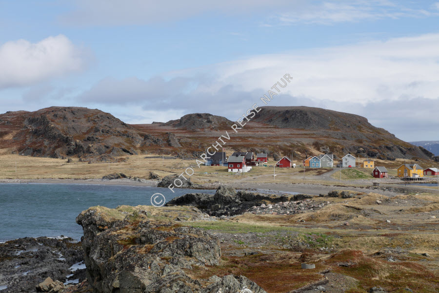 Bauwerk, Berlevåg, Dorf, Farbe, Finnmark, Fischerdorf, Gebäude, Haus, Holzhaus, Kulturlandschaft, Landschaft, Lappland, Norwegen, Tal, Trogtal, Varanger, Veines, Weiler, bunt,