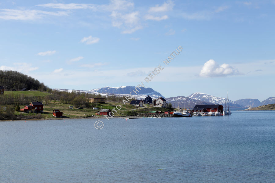 Keywords: Bauwerk, Berg, Bergrücken, Dorf, Finnmark, Fischerdorf, Fischereihafen, Gewässer, Hafen, Kulturlandschaft, Landschaft, Lappland, Meer, Mole, Neverfjord, Nordmeer, Norwegen,