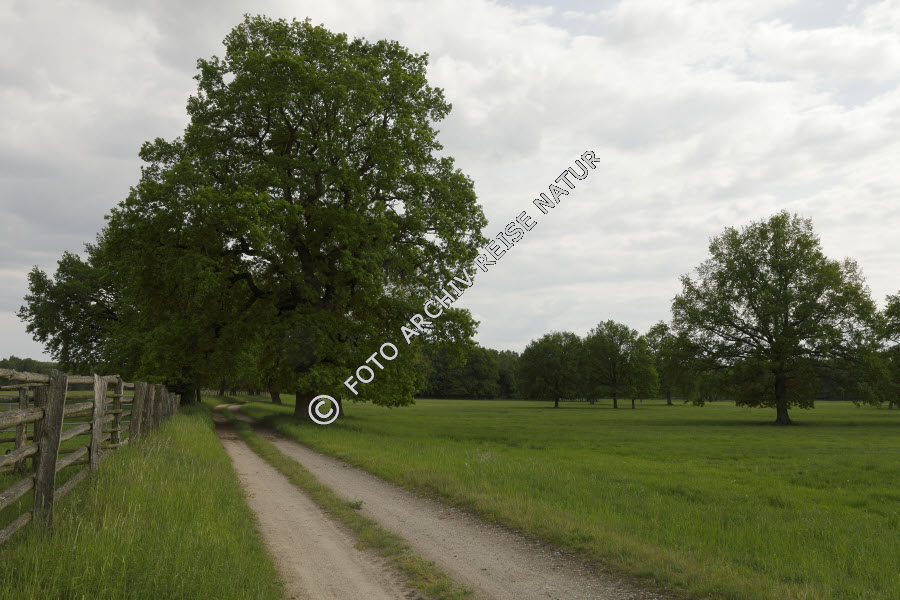 Baum, Bauwerk, Buchengewächs, Deutschland, Eiche, Quercus, Einfriedung, Fahrweg, Flora, Gatter, Holzzaun, Kulturlandschaft, Lattenzaun, Mecklenburg-Vorpommern, Müritz, Müritz Nationalpark, Ort, Verkehrsweg, Waren, Weg, Weide, Wiese, Zaun, Zaunpfahl,