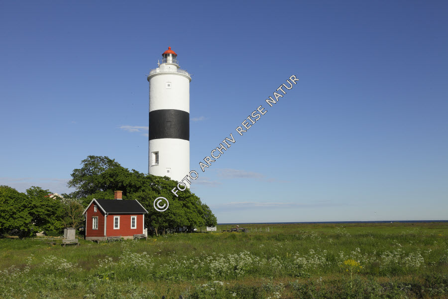 Keywords: Baum, Bauwerk, Farbe, Flora, Gebäude, Gewässer, Haus, Holzhaus, Landschaft, Leuchtturm, Marschland, Meer, Naturschutzgebiet, Ort, Ostsee, Ottenby, Turm, blau, rot, weiß,