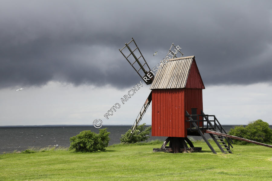 Bauwerk, Bockmühle, Farbe, Gebäude, Gewässer, Kalmarsund, Kulturlandschaft, Landschaft, Meer, Mühle, Ostsee, Rasen, Wiese, Windmühle, grün, rot,