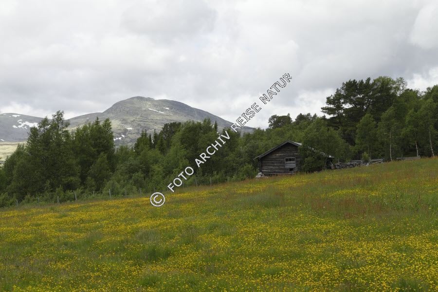 Keywords: Almwiese, Bauwerk, Berg, Bergkette, Bergwiese, Blockhaus, Blumenwiese, Gebirge, Gebäude, Gipfel, Haus, Hedmark, Holzhaus, Kulturlandschaft, Landschaft, Norwegen, Weide, Wiese, Øversjødalen,